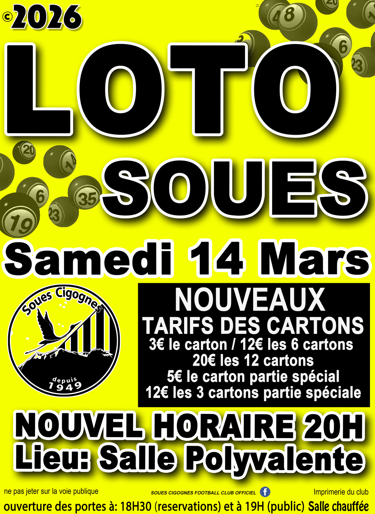 Accueil > Actualités > Festivités, animations Loto Foot Publié le 06/03/2026 L'association Soues Cigognes Foot organise samedi 14 mars un loto Rendez-vous à la Salle Polyvalente à 20h00 Actualité précédente