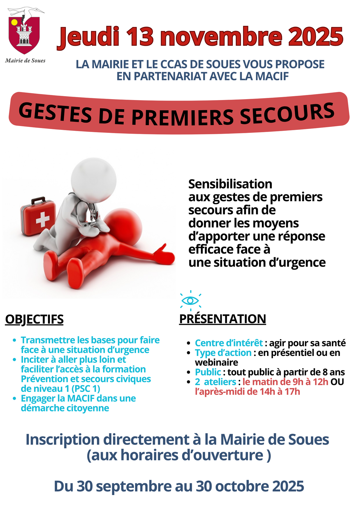 Dans le cadre d’une sensibilisation aux gestes de premiers secours et afin de donner à tous les moyens d’apporter une réponse efficace face aux situations d’urgence, un atelier gratuit vous sera proposé par la Mairie et le CCAS de Soues, en lien avec la Macif :